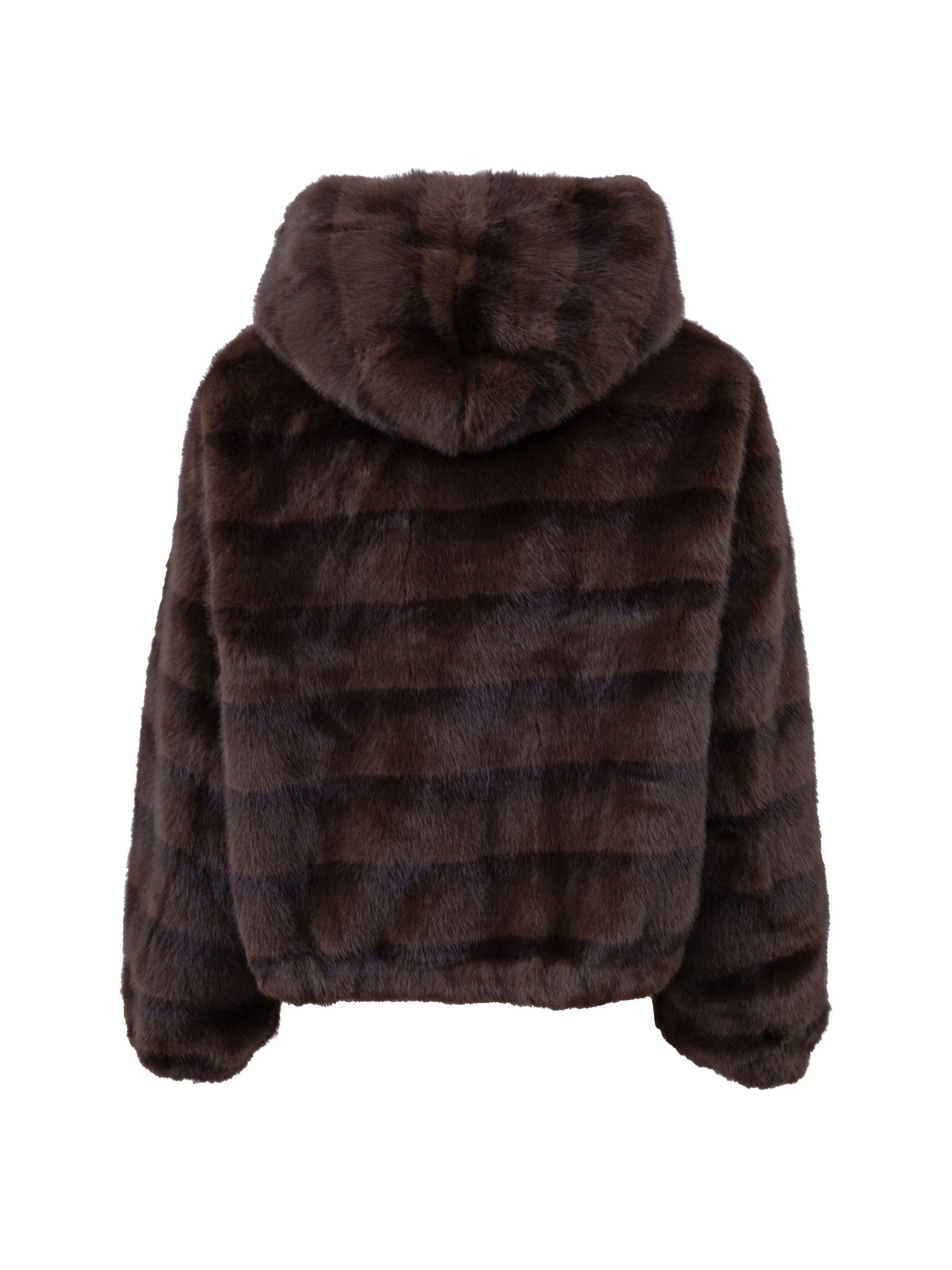 This short faux fur coat with hood is a must-have for facing winter in style. Soft, warm, and with a modern design, it envelops you elegantly without sacrificing practicality. The short cut flatters the figure, while the hood adds a casual yet functional touch, perfect for colder days.